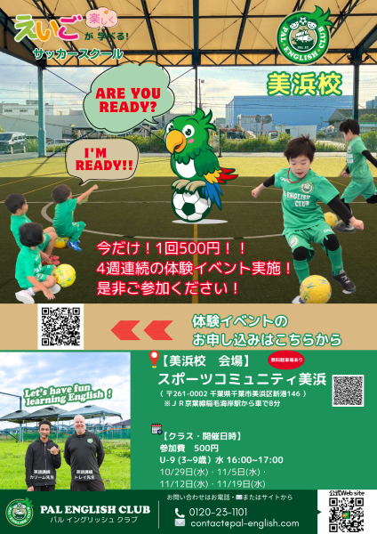 スポーツコミュニティ美浜グランドにて10月29日(水)より1回500円のワンコイン体験レッスンを実施いたします。