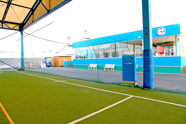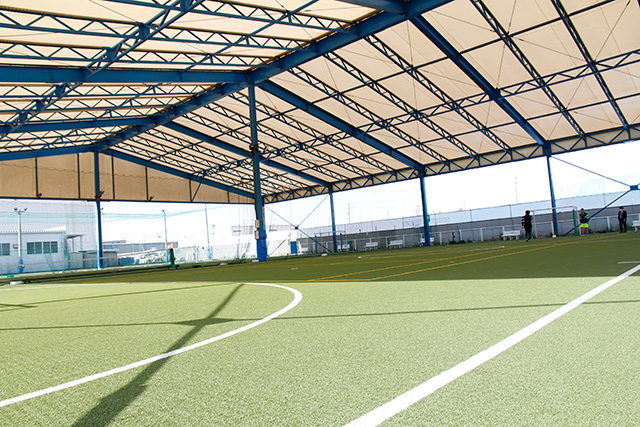 【美浜校】グラウンドにはテント屋根が設置されていますので雨の日もレッスンすることが可能です。また直射日光も遮ることが出来、インドアな感覚でプレーできます。